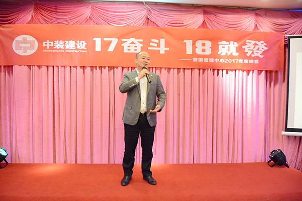 中装建设总裁庄展诺肯定了营销管理中心2017年度取得的各项成绩,同时指出: 2018年是攻坚之年,我们面临着巨大的压力,同时也会迎来更多机遇,2017营销中心已书写传奇,2018更要一起奋发,不忘初心,砥砺前行,打造中装建设第一业务单元,谱新篇章,再创新辉煌。