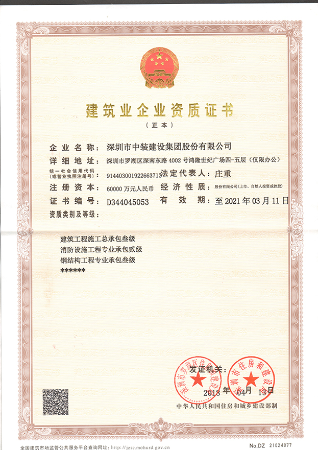 至此,中装建设已经具有乐投平台专项工程设计甲级、建筑装修装饰工程专业承包壹级、建筑幕墙工程专业承包壹级、电子与智能化工程专业承包壹级、建筑机电安装工程专业承包壹级、防水防腐保温工程专业承包壹级、展览陈列工程设计与施工一体化壹级资质、建筑工程施工总承包叁级资质等行业从业资质。