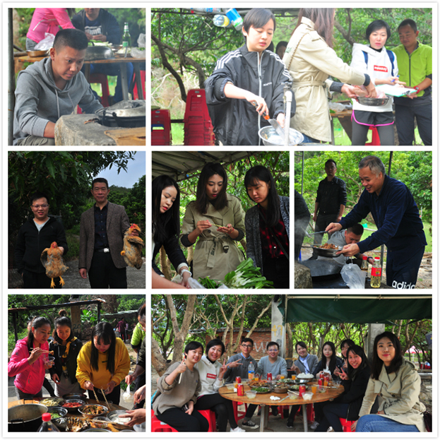 上午十点,队伍抵达目的地,接受第一项任务考验——“自助野炊”,以小组为单位,相互合作,就地取材,共同制作美味佳肴。每个组分工不同,有的杀鸡、宰鱼、摘菜,有的烧柴生火,有的炒菜做饭。每个组菜色也不同,有的北方做法偏辣,有的南方做法偏淡。个个忙的不亦乐乎,经过了大家的辛勤努力,终于品尝到了各色美食,有的人这桌吃吃,那桌尝尝,欢声笑语不断。